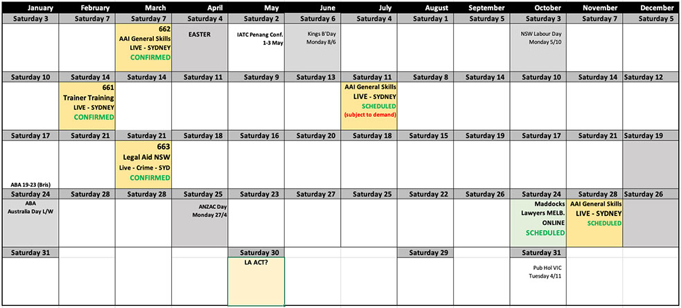 The AAI relies heavily on you giving your time to the AAI Faculty. Please let me know your availability to join any workshop on the schedule below ... we may already have a full faculty for any one workshop or we may be searching to fill places. It's always good to know who can help. Call or email Scott [0418 473 303 or aai@advocacy.com.au].